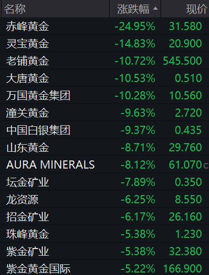 黄金股集体下挫,赤峰黄金跌近25%,灵宝黄金跌超14%,老铺黄金大唐黄金、万国黄金海外跌超10%。