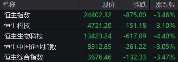3月23日,港股主要指数早盘大幅下挫,终了午间收盘,香港恒生指数跌3.46%,恒生科技指数跌3.10%。