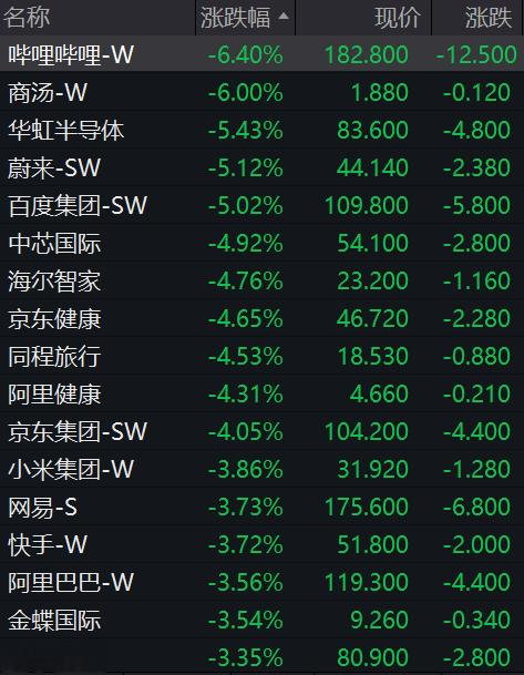 科网股普跌,哔哩哔哩、商汤跌6%,百度集团、蔚来跌逾5%,京东集团跌超4%,BG真人(BigGaming)官方网站小米集团、网易、快手跌超3%。