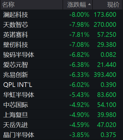 半导体板块领跌,澜起科技跌8%,兆易蜕变跌逾6%,华虹半导体跌超5%,中芯海外、上海复旦跌近5%。