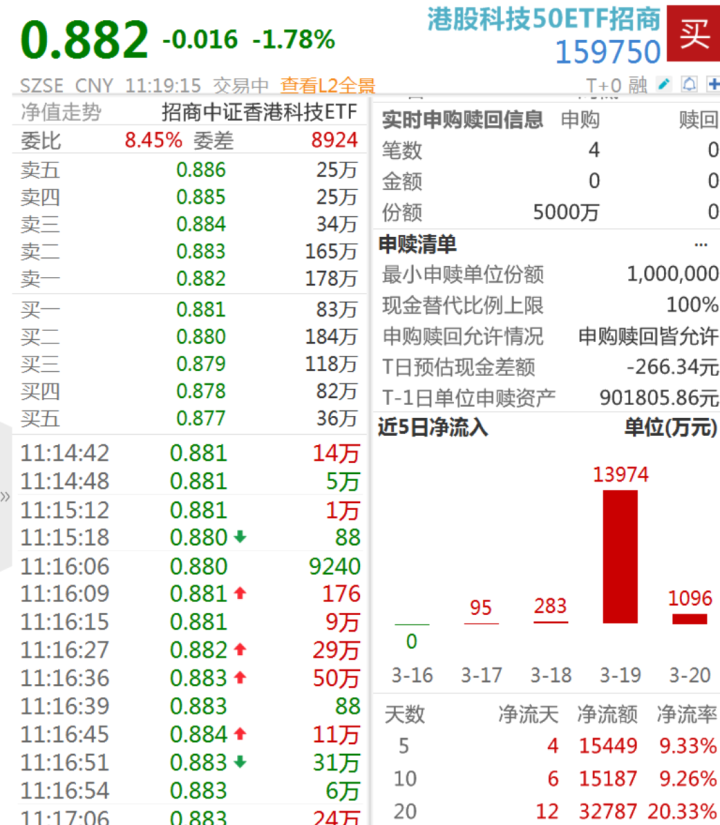 关系品种受资金柔柔。港股科技50ETF招商(159750)近4个往翌日获资金勾通净流入超1.5亿元,本日盘中,资金继续净申购超4000万元。