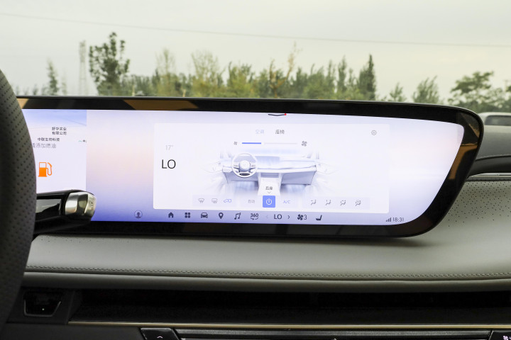 中控屏幕和姿首盘袭取了连屏商量,我这次试驾的陆尊为30英寸的6K中控屏屏,悬浮式的造型让科技感和当代感扑面而来。屏幕的边框很窄,黑边约束得也还可以。空调出风口的商量也很有崇拜,袭取了荫藏式的商量,协调周围的饰条,有几分淡雅感。